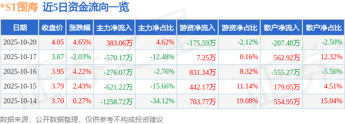 10月20日的资金流向数据方面,主力资金净流入383.06万元,占总成交额4.62%,游资资金净流出175.59万元,占总成交额2.12%,散户资金净流出207.48万元,占总成交额2.5%。